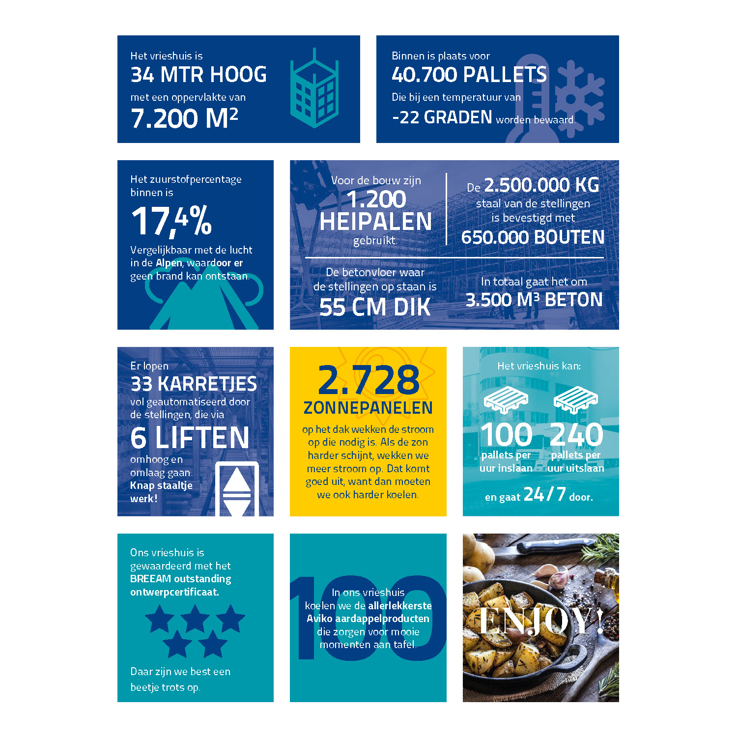 De medewerkers van Aviko lopen nu elke dag trots door hun nieuwe pand, een volledig geautomatiseerd vrieshuis. In relatief korte bouwtijd gerealiseerd en perfect aansluitend op hun wensen. Iets dat mogelijk is gemaakt omdat onze mensen samen met Aviko voor elk detail op zoek zijn gegaan naar de best passende invulling. Door een stevige relatie met vaste onderaannemers en partners waar we de fysieke realisatie mee doen, ontstond er op de bouwplaats ook een team van samenwerkende partijen met een gemeenschappelijk belang: van waarde zijn voor elkaar.